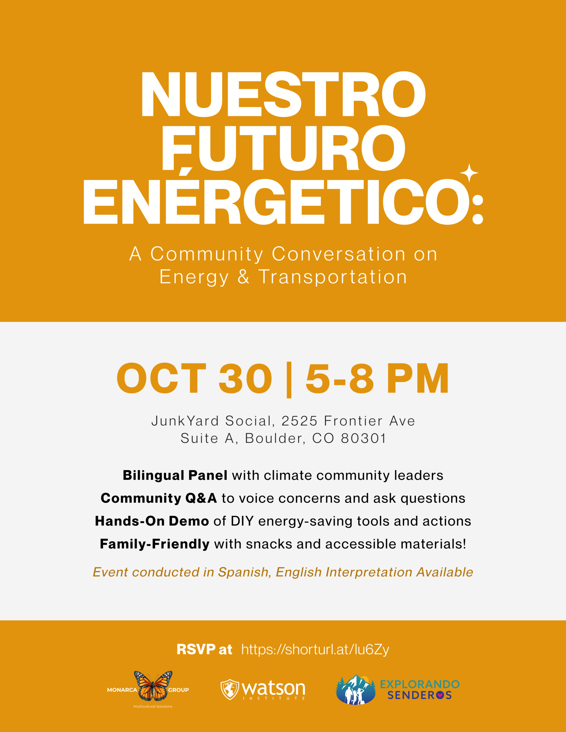 Join our friends at Monarca Group for Nuestro Futuro Energético, a vibrant, bilingual community event in collaboration with Voces en el Sendero. This event, conducted primarily in Spanish with English interpretation, empowers Latino families and entrepreneurs to access clean energy programs, sustainable transportation solutions, and resources to save money while fostering community well-being.
