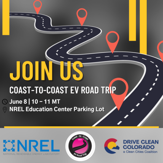 Join Drive Clean Colorado on June 8, along with the National Renewable Energy Laboratory (NREL), in hosting the Colorado stop of Connecticut Southwestern Area Clean Cities Coalition’s Coast-to-Coast EV Road Trip. This event highlights the partnership between NREL and Clean Cities Coalitions nationwide, as well as the state’s advancements in transportation electrification and charging infrastructure. Partnering with 20 Clean Cities Coalition across the country, this 5,100 mile EV Road Trip supports the mission of reducing range anxiety, a leading barrier to EV adoption.