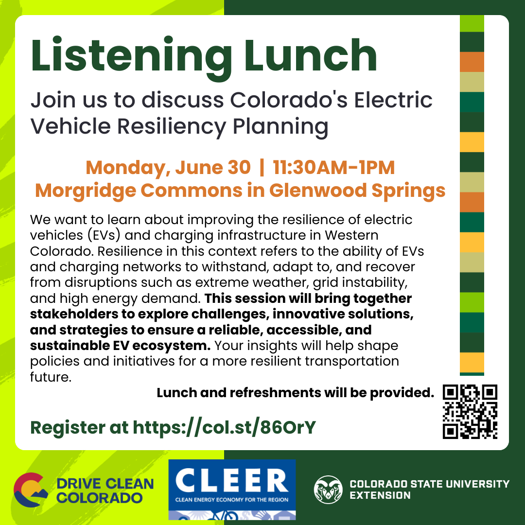 Join us and spread the word! Colorado State University, Clean Energy Economy for the Region (CLEER), and Drive Clean Colorado are hosting a listening session on Monday, June 30th from 11:30 – 1:00PM at the Morgridge Commons in Glenwood Springs.