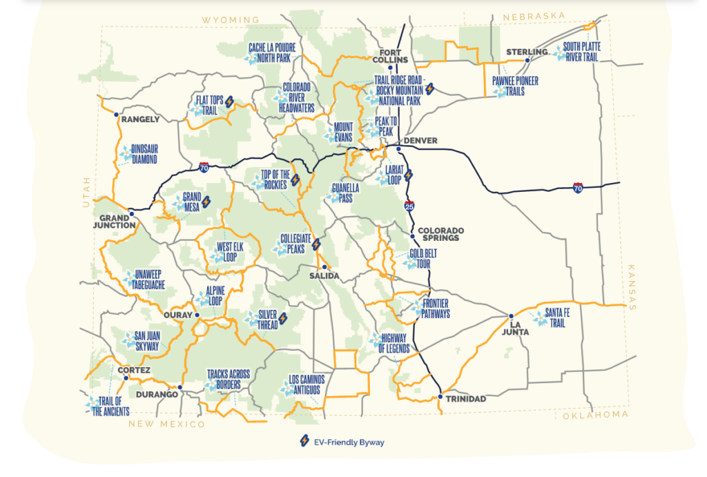 With 26 scenic byways in Colorado, ChargeWest was developed as an EV corridor collaborative across eight states in the Intermountain West region, committed to improving Electric Corridors throughout rural gateway communities, state and national parks, and scenic byways. Although, the Intermountain West region has improvements to be made, EV charging is still accessible, especially within the State. Colorado’s 26 scenic byways span from Durango to Sterling, and over half of them offer access to EV charging.