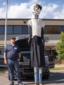 Pictured to the left is a Phil Long Dealer, Seth, posing with a skeleton at our Dia de los Muertos Ride and Drive event. They provided a Ford Lightning, electric truck for participants to test drive.